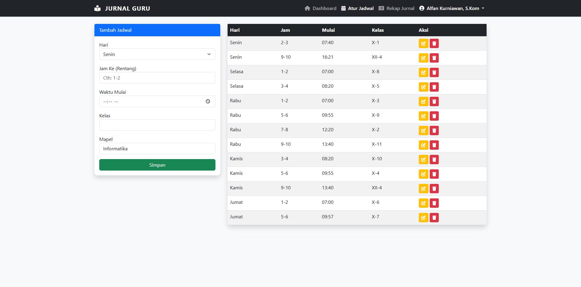 Manajemen Jadwal Mandiri: Guru dapat mengatur jadwal mengajar sendiri (Hari, Rentang Jam, Waktu Mulai, dan Kelas) serta mata pelajaran (contoh: Informatika).