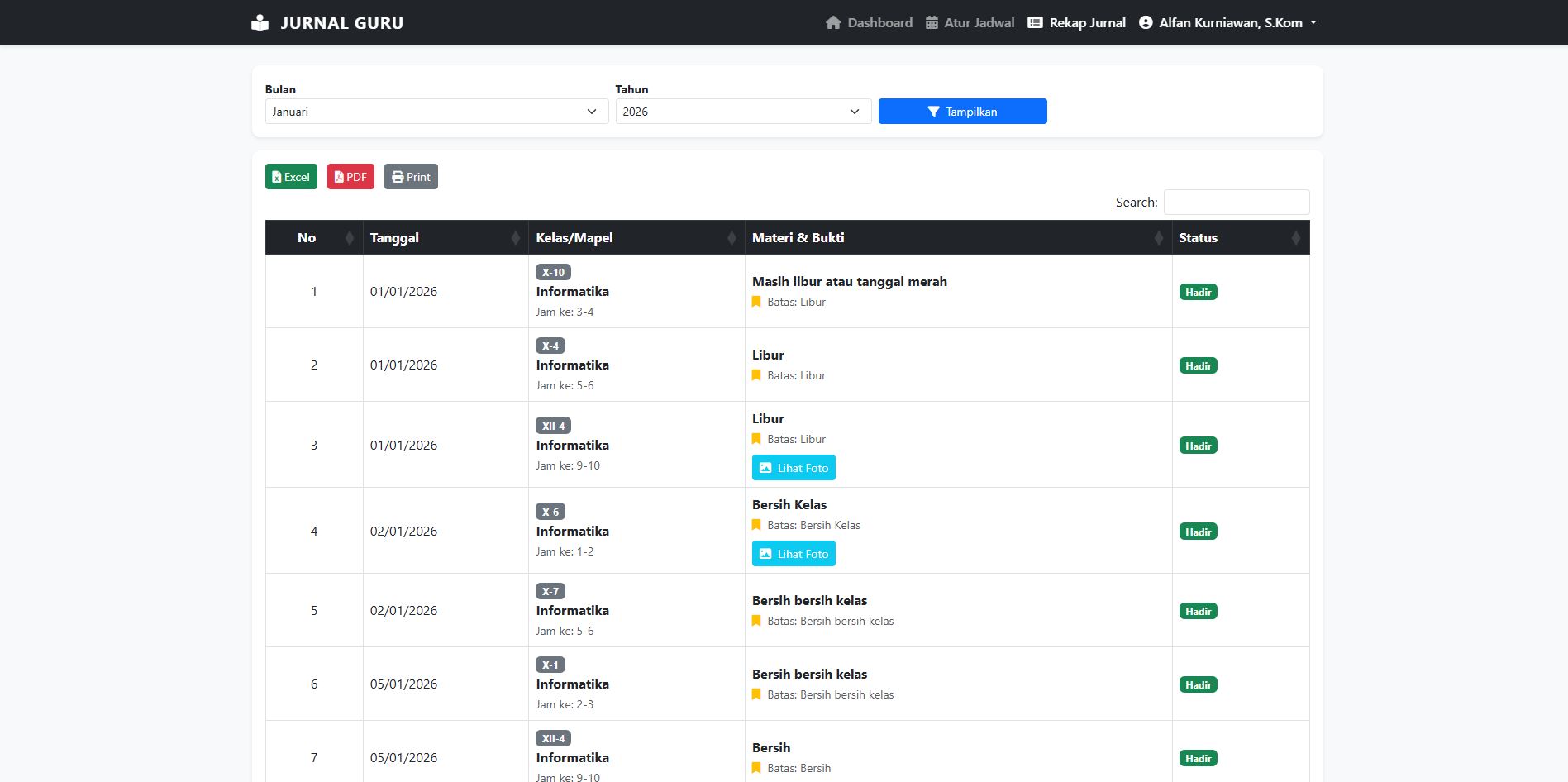 Rekap Jurnal Otomatis: Laporan bulanan dan tahunan yang dapat difilter dan diekspor ke dalam format Excel, PDF, atau Cetak Langsung hanya dengan satu klik.