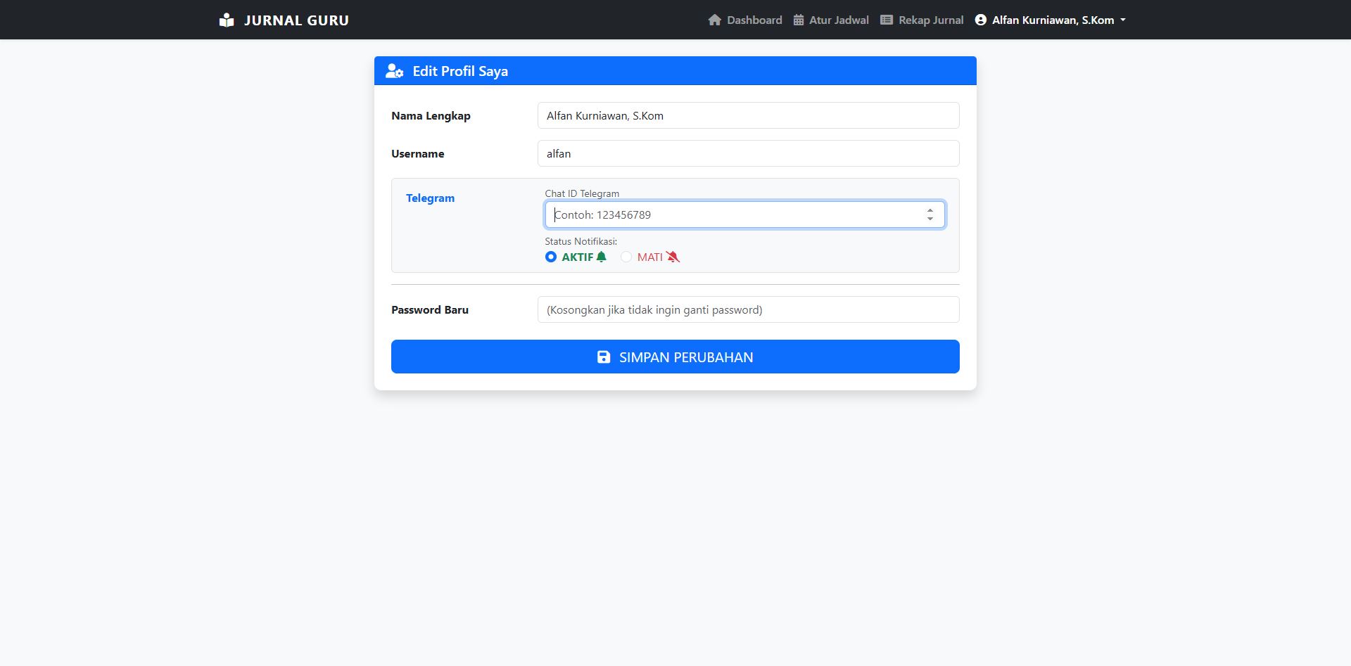 Integrasi Notifikasi Telegram: Fitur khusus untuk menghubungkan akun guru dengan Telegram (via Chat ID) guna menerima pengingat jadwal atau status pelaporan secara otomatis.