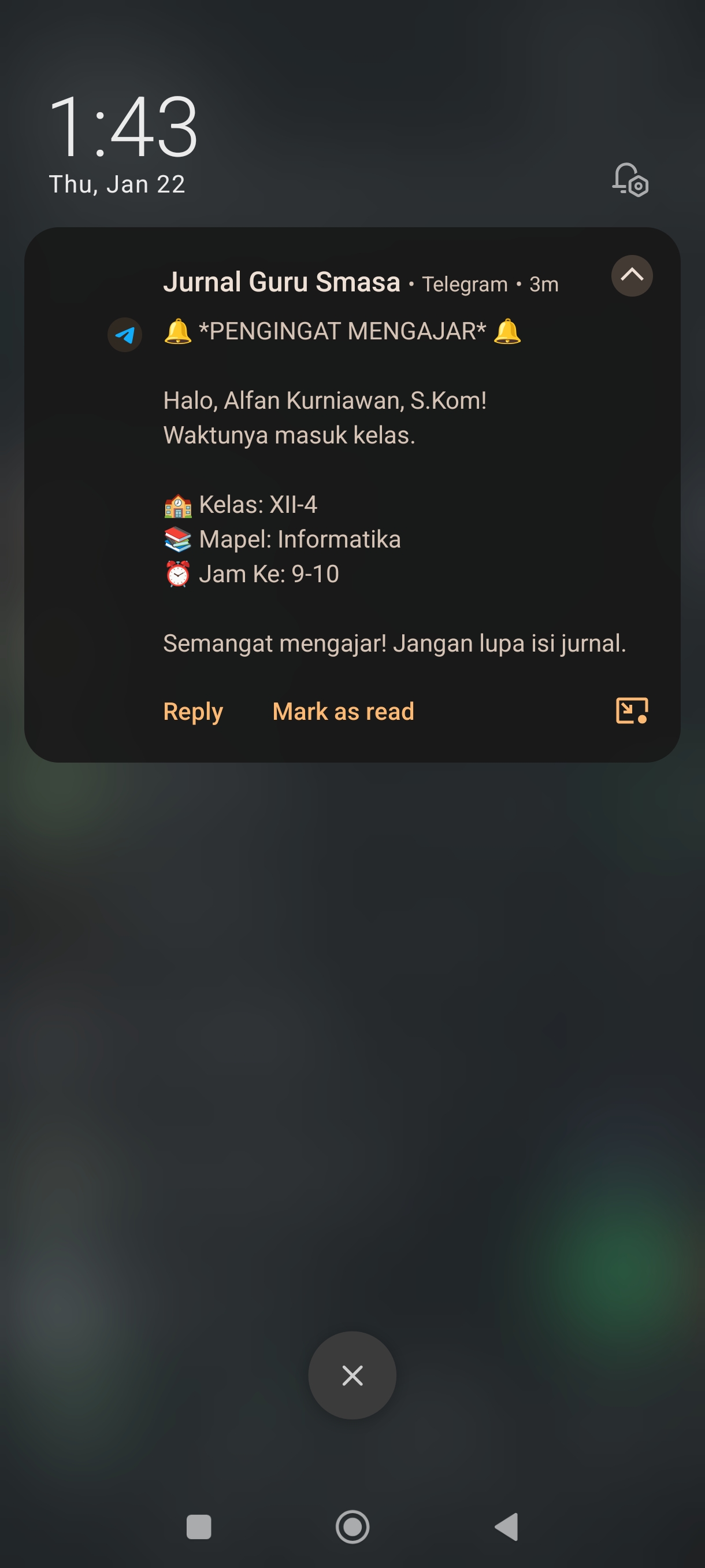 Kedisiplinan: Notifikasi Telegram membantu guru tetap disiplin sesuai jadwal yang telah diatur.