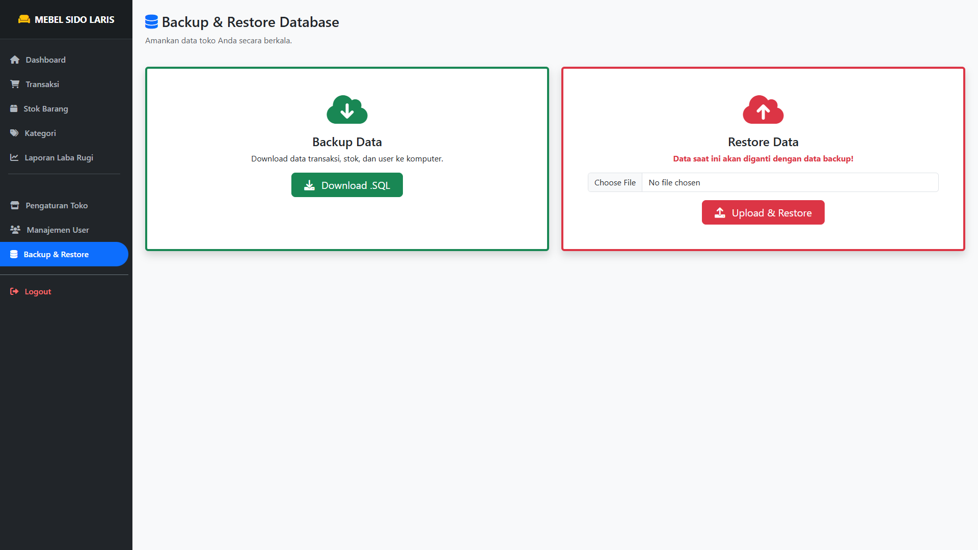 Backup & Restore: Data bisa di-backup kapan saja. Komputer rusak? Data tetap aman dan bisa dikembalikan.