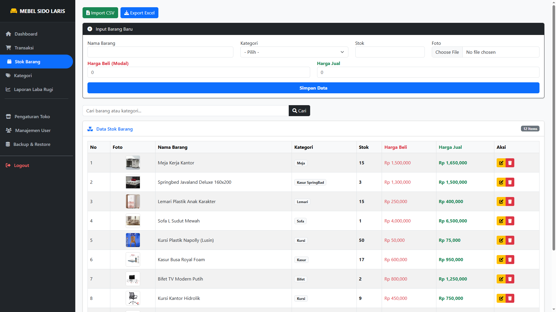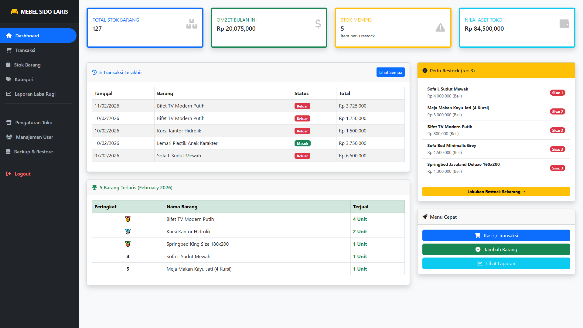 Peringatan Stok Menipis: Sistem otomatis memberi tahu barang apa yang harus segera di-restock (kulakan) agar tidak kehabisan saat ada pembeli.