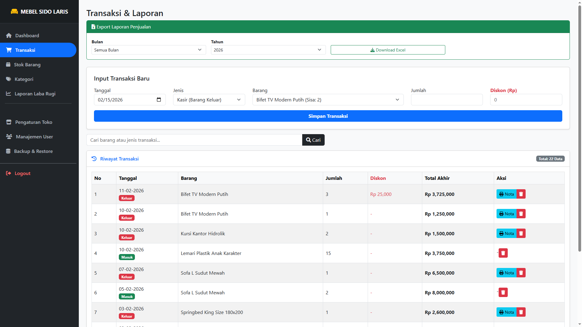 Fitur Diskon: Bisa memberikan potongan harga (Rp) langsung di nota untuk pelanggan setia.