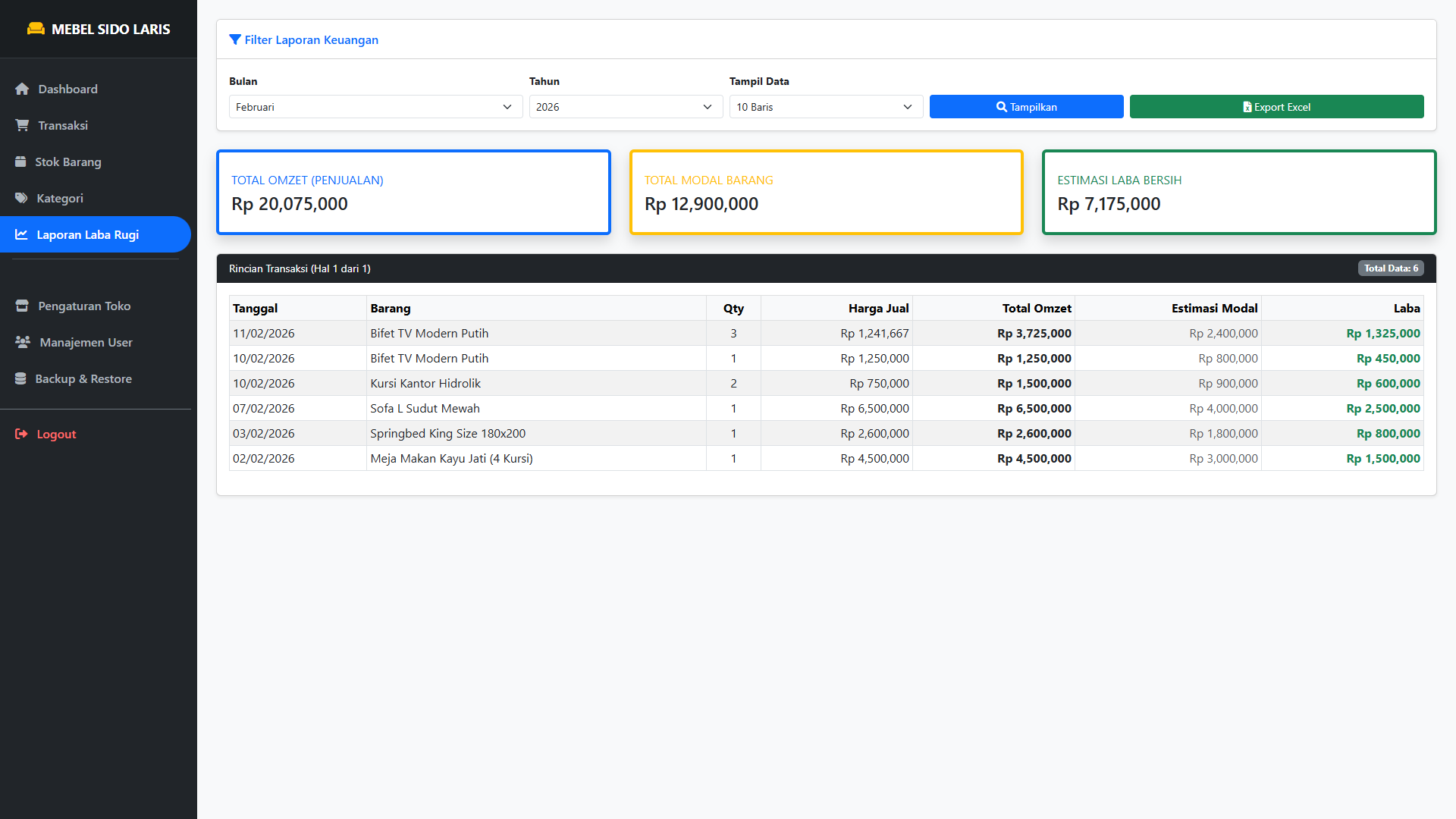 Tidak perlu kalkulator lagi. Sistem menghitung Total Omzet - Total Modal = Laba Bersih.